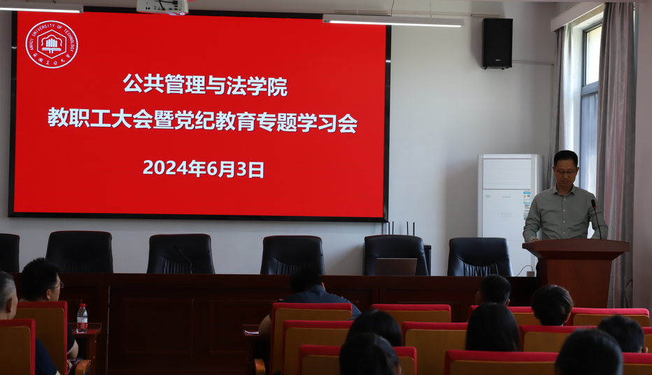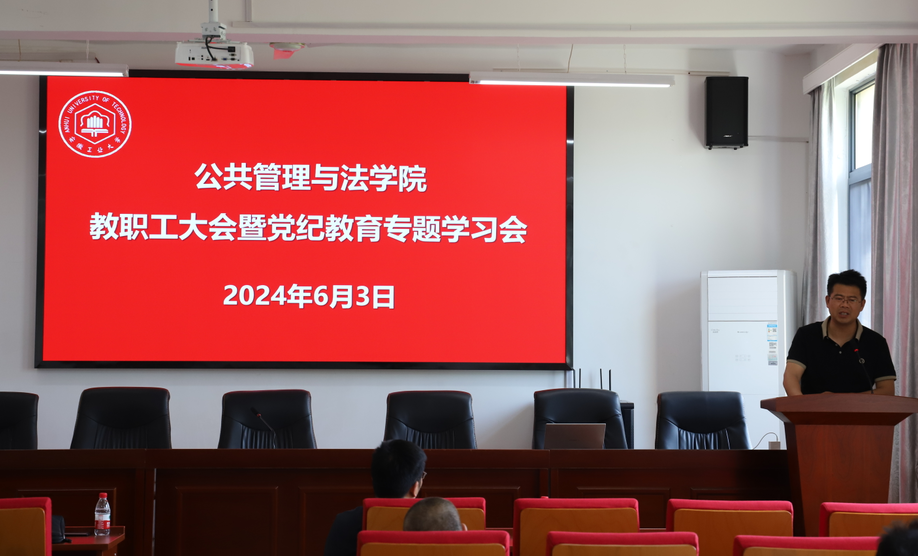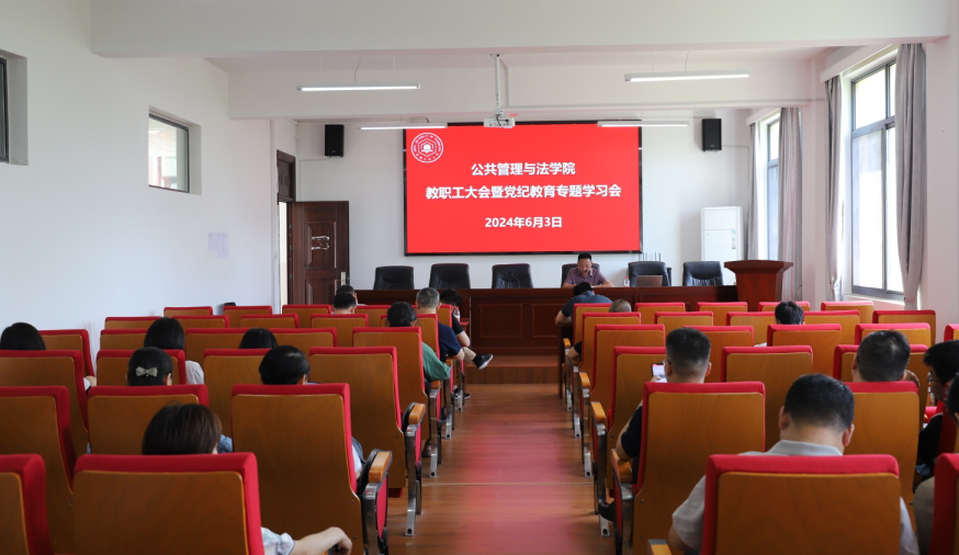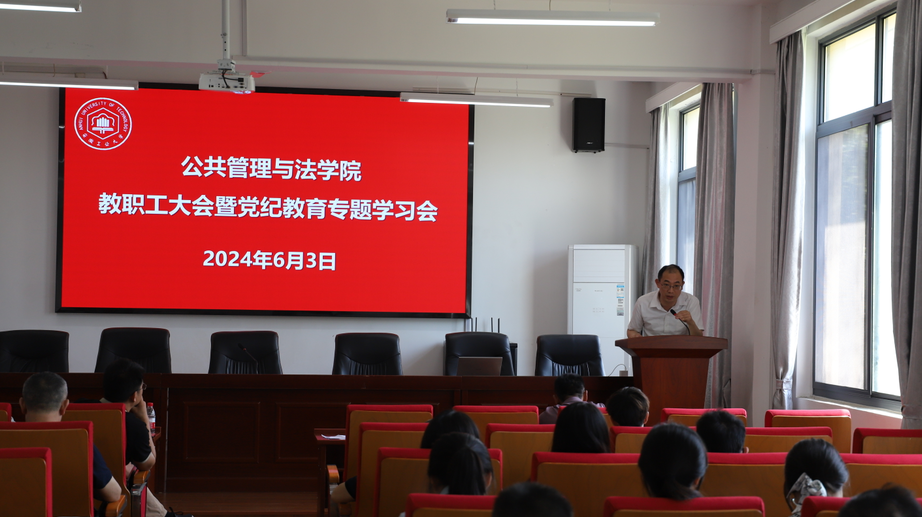 在学院301报告厅召开教职工大会暨党纪学习教育专题会。学院党委书记胡正友主持会议,学院全体教职工、公共事业管理本科生党支部学生党员参加会议。