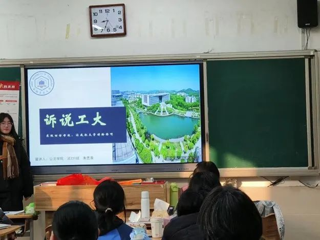 宣讲过程中,首先我通过一段简短的视频介绍我校的办学历程、教学水平、知名校友、专业设置、科研成就、就业率和升学情况等,再运用数据图配文字解释的方式详细地介绍我校专业设置、保研率就业率、录取原则和志愿填报等内容,其中有重点宣传公法学院的几大专业,尤其社保专业已被列入十大新兴专业之一。紧接着,我利用平常随手拍和私下收集的校园风景照片向学弟学妹展现安徽工业大学的环境优美宜人,照片上的四季美景和安工大的标志性“打卡点”引来了学弟学妹的阵阵欢呼声,讲台下有学妹发自肺腑地表示:“安工大的白桦林好美啊”。其次,我还向他们介绍我校优质齐全的硬件条件、新鲜可口且种类多样的饭菜、整洁宽敞且温馨的宿舍环境、完备先进的教学设施,学弟学妹看到一张张美食照片呈现在PPT上,不禁发出“哇塞”的感慨,我想他们是在感慨工大的美食“色香味俱全”啊。并且我通过一系列活动组图向无为中学的学弟学妹们介绍我校学子丰富多彩的课余生活,以此展现安工大学子阳光朝气的精神风貌。同时结合我自身当时面临的困难和茫然,指出他们现阶段学习过程中可能会产生的问题,并分享自己高三的经历和一些自己的学习见解。最后,表达对学弟学妹2024年高考大捷、金榜题名的祝福,也再次表示欢迎学弟学妹报考安徽工业大学。