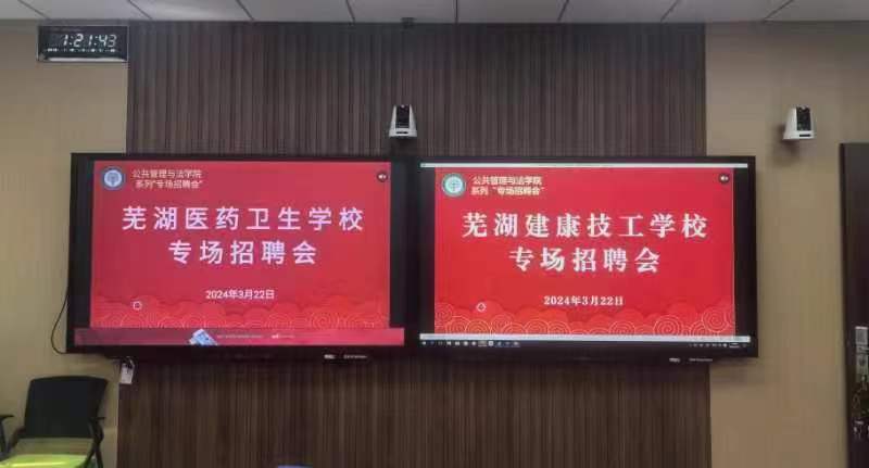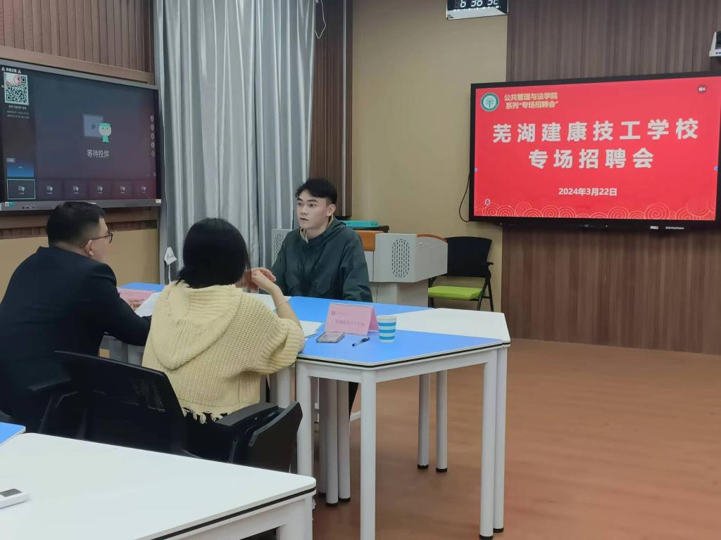 邀请芜湖医药卫生学校、芜湖建康技工学校来院开展毕业生专场招聘活动。招聘会在公法学院202智慧教室举行。