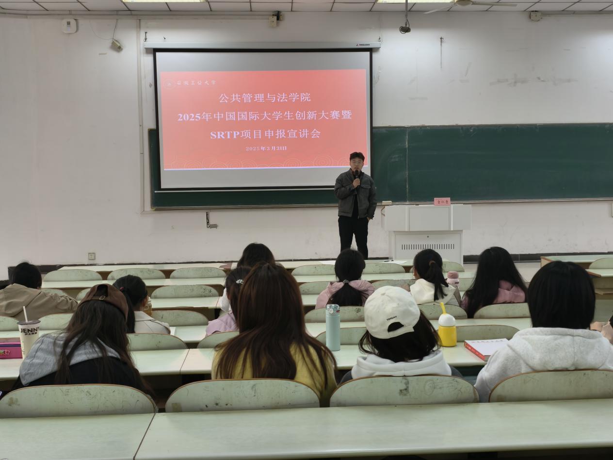 2025年中国国际大学生创新大赛暨SRTP项目申报宣讲会。公法学院实验实训中心主任、硕士研究生导师宫仁贵、院团学工作负责人钱前出席,各年级共200余学生参加。