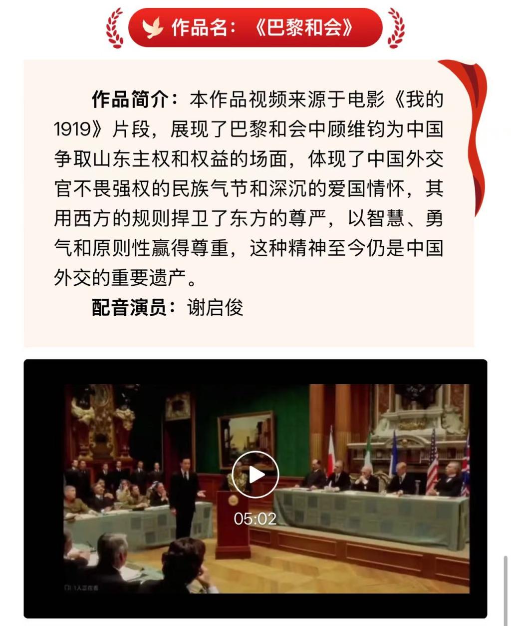 谢启俊凭借精准的诠释和独特的创意脱颖而出,荣获一等奖。这段视频素材节选自历史题材影片《我的1919》//mp.weixin.qq.com/s/anj01z9DdEZXMHGX3Stmdw,生动再现了巴黎和会期间中国外交家顾维钧为维护国家主权而据理力争的场景。展现了近代中国外交官的民族气节与爱国情操,至今仍深刻影响着当代中国的外交实践。彰显出学院学子在文化艺术与历史底蕴方面的高水准,为学院增光添彩。