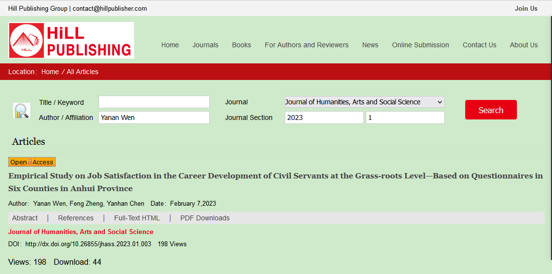 问延安老师所撰写的《Empirical Study on Job Satisfaction in the Career Development of Civil Servants at the Grass-roots Level—Based on Questionnaires in Six Counties in Anhui Province》在Journal of Humanities, Arts and Social Science 的2023年7卷1期上发表。