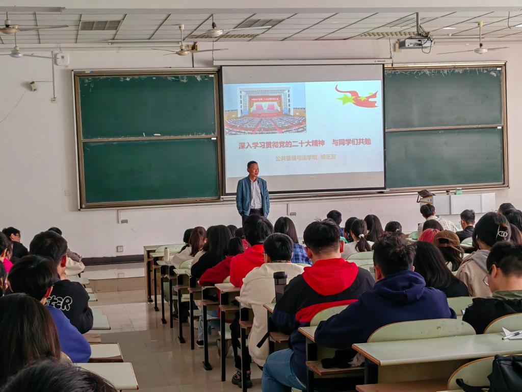 10月29日,院党委书记胡正友以“深入学习领会党的二十大精神,争做新时代青年楷模”为题宣讲党的二十大精神,公法学院、工程研究院部分同学参加了宣讲活动。