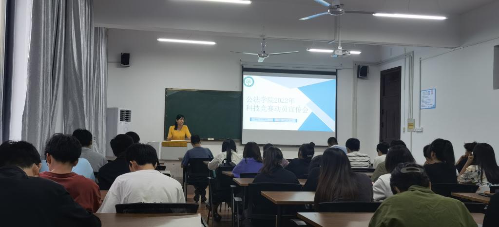 2022年9月13日下午,公法学院在本部公法楼205举行科技竞赛动员宣传会,学院教学副院长孔东菊老师出席,指导教师代表、各年级学生代表80余人参加,院团委书记邢维迢主持。