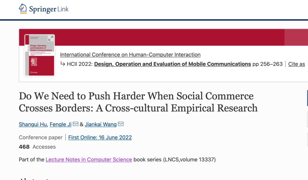 王建凯同学在 HCII 2022在线发表最新研究成果 “Do We Need to Push Harder When Social Commerce Crosses Borders: A Cross-cultural Empirical Research”(//link.springer.com/chapter/10.1007/978-3-031-05014-5_21)。胡善贵副教授为第一作者,我校为第一单位,通讯作者为安徽工业大学商学院冀凤乐和黄色网站