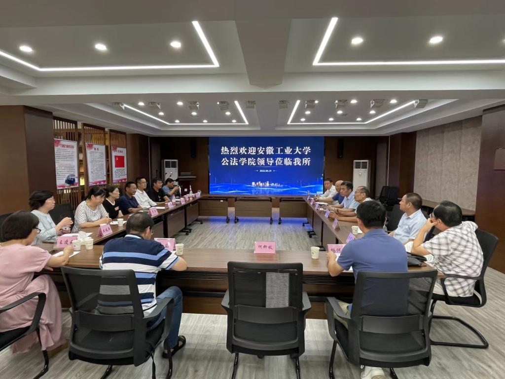 就进一步深化推进院所合作至安徽华冶律师事务所开展现场交流。安徽华冶律师事务所合伙人会议主席周巧龙、所主任孙宁,相关部门负责人和部分骨干律师接待了学院一行,公法学院党委书记胡正友、院长徐济益,以及学院领导班子全体成员、办公室主任、法学系主任和党支部书记参加了交流。