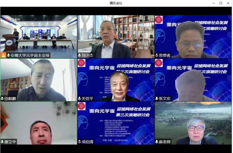 2022年4月16日,安徽大学社会与政治学院联合中国人民大学社会学理论与方法研究中心、吉林大学哲学社会学院、中央民族大学民族学与社会学学院、中央财经大学社会与心理学院、西安交通大学人文社会科学学院、西北农林科技大学人文社会发展学院共同主办,安徽大学数字乡村建设研究院具体承办的“面向元宇宙:迎接网络社会发展的第三次浪潮研讨会”以线上线下相结合的形式,在安徽大学磬苑校区隆重开幕。安徽大学党委书记蔡敬民教授,中国社会学会前会长、上海大学伟长学者李友梅教授,中国社会学会会长、中国社会科学院大学社会学院院长陈光金教授分别致开幕辞。