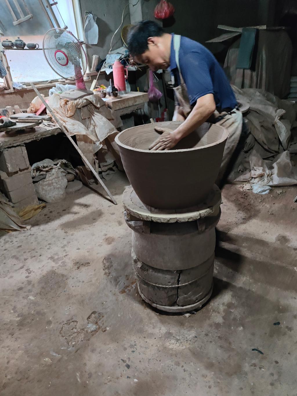 图为陶艺师傅进行现场作业