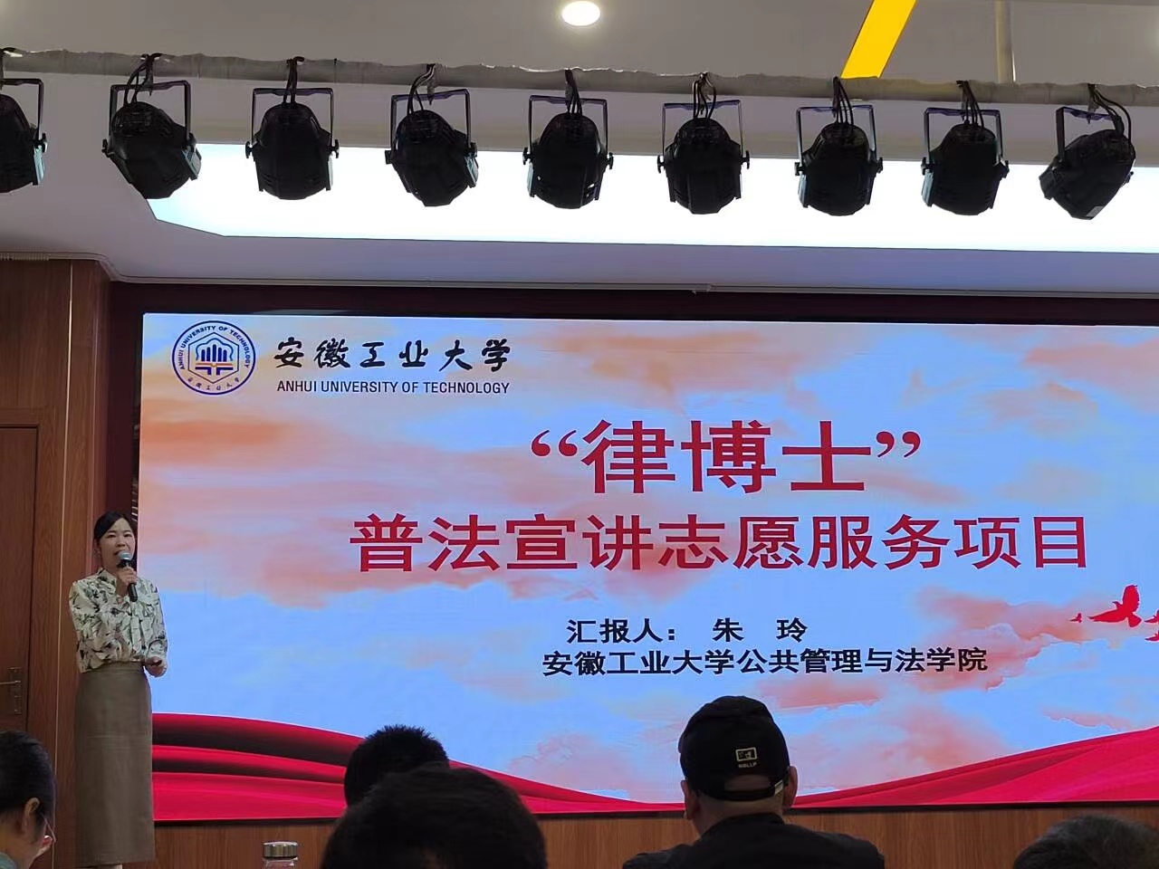 “律博士”普法志愿服务队参加竞赛,“律博士”普法志愿服务队立足于安徽工业大学校级普法宣传平台,以青年力量进行法制宣传教育,不断增强普法宣传面及法治的渗透力,经过项目决赛角逐,“律博士”普法志愿服务队获马鞍山第五届新时代文明实践志愿服务项目大赛三等奖。