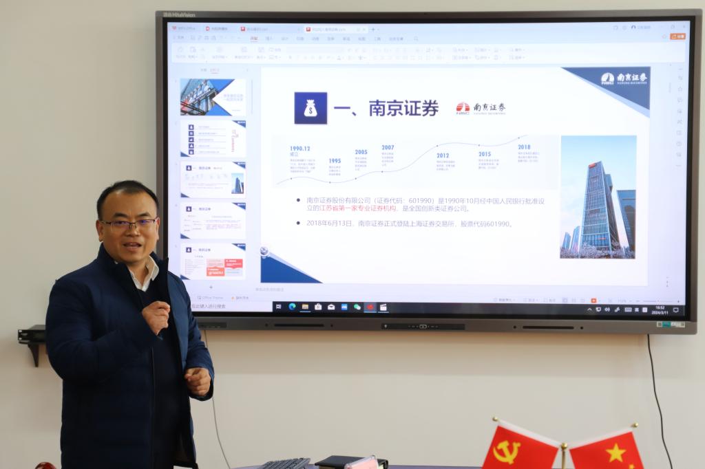 徐华良总经理作了《牵手南京证券一起奔向未来》的招聘宣传报告,介绍了南京证券及南京常府街证券营业部的基本概况、岗位设置、招聘需求及相关程序。徐华良说,南京证券公司对法学和公共管理专业人才都有需求,来安工大公法学院招聘宣传也是南京证券“投资者进百校”活动的重要部分,试图向在校大学生普及资本市场及证券投资的相关知识,将证券投资业作为大学生就业的一个选择。徐华良进一步说,南京证券公司也给在校大学生提供专业实习实践机会,让有志参与中国投资业的同学提前做好理论与实践知识储备,从而较快地获得相关从业资格,并愿意和相关院系共建“南京证券投资者教育基地”。