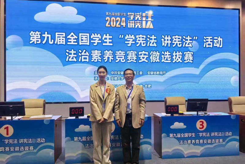 此赛事学校选拔赛由校团委主办,公法学院团委承办,所选拔的选手在参加此次安徽省比赛中斩获多项荣誉,法学系主任徐刚指导的法221班吴黛欣同学、法232班刘晴晴同学分获安徽省法治素养竞赛大学组二等奖和三等奖,法222班杨超然同学获安徽省演讲竞赛大学组三等奖,法224班苏宁同学获演讲竞赛大学组优秀奖。
