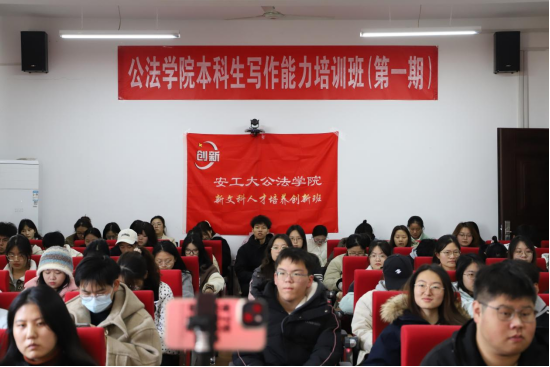 为深化“三全育人”综合改革平台建设,贯彻“天地人和”新文科人才培养理念,提升本科生的学术研究素养与写作能力,2024年11月27日,公法学院本科生写作能力培训班开班式暨首场专题讲座会在301报告厅隆重举行。院党委书记胡正友,院长徐济益,院党委副书记、副院长周浩然,正处级组织员江文丽,公共事业管理系党支部书记、首场讲座嘉宾施磊磊,创新班班主任韦子平,2023级辅导员朱玲出席开班式,120名培训班学员参加开班式并聆听首场讲座。副院长王务均主持开班式和讲座会,并作讲座总结。