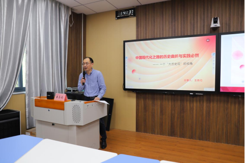王老师从中国式现代化之路的转型危机、历史逻辑、失败教训、实践经验等维度,探究了导致中华帝国陷入“转型锁定”的经济政治制度和文化意识形态因素,指出正是这些因素禁锢了明清时期社会生产力的进一步发展,导致传统中国进入长达数百年的生产率低下或停滞阶段,进而使这个拥有古老文明与辉煌的国度被西方列国所超越。最后,王老师通过近代中国多个社会阶层和政治派别推动国家现代化转型“集体失败”的历史事实,让同学们深切体会和理解中国共产党带领中国人民走向现代化发展之路的历史功绩,激发青年大学生自觉投身中国式现代化建设的巨大热情。(撰稿:韦子平,陈科伊,赵默然;摄影:赵默然;审核:王务均)