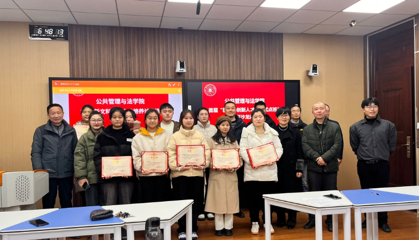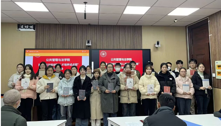 “新文科”创新人才培养试点班表彰大会在智慧教室举行。院党委书记胡正友、副院长杨哲,教师代表汪伟、袁同成、刘梅、吴鹏,辅导员陈云、钱前,以及试点班全体学员和2023级新生代表参加了表彰大会。会议由副院长王务均老师持。